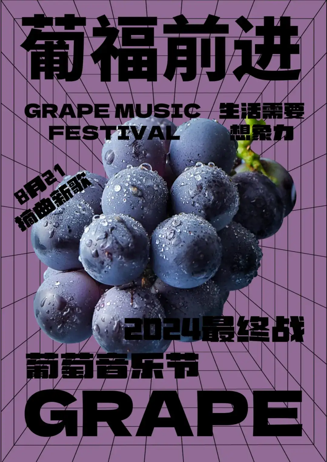 然后给背景分成上中下三块,给两个明度和饱和度都拉满的纯色调。其中一个空间遮挡葡萄,其中一个空间被遮挡。